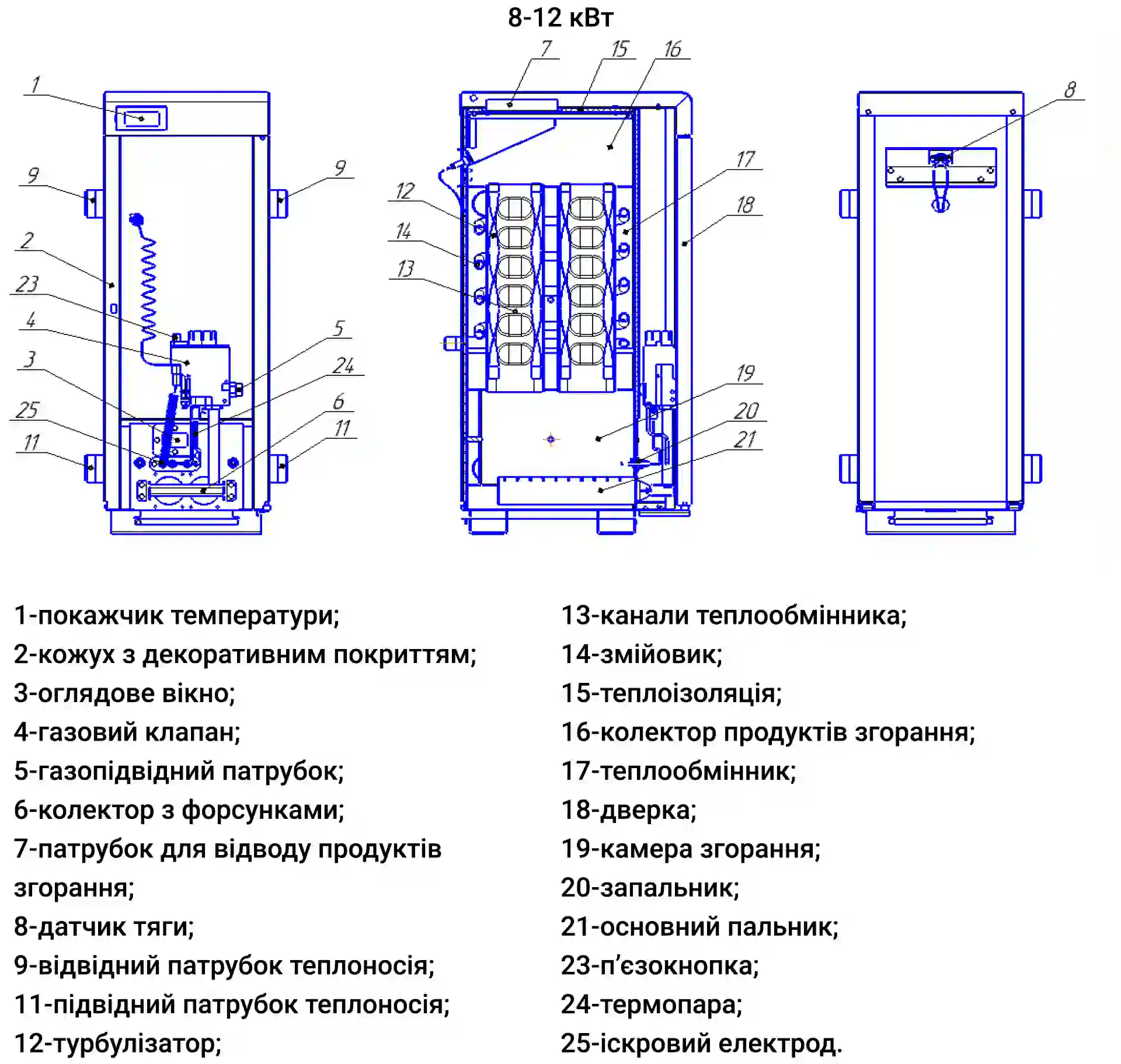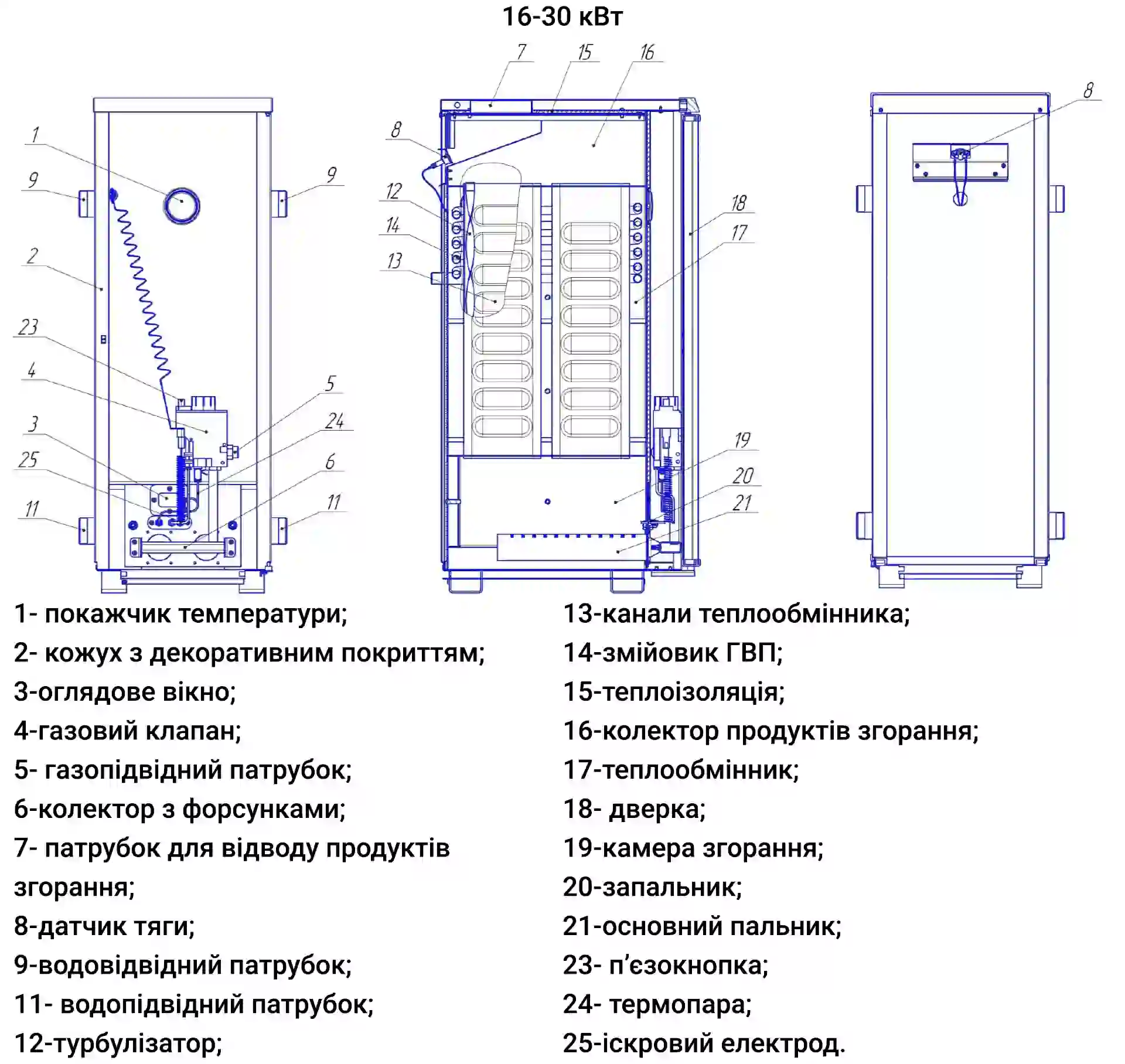 - Антикорозійне покриття. Сталевий теплообмінник та корпус захищені спеціальною порошковою фарбою, стійкою до механічних пошкоджень та перепадів температур.