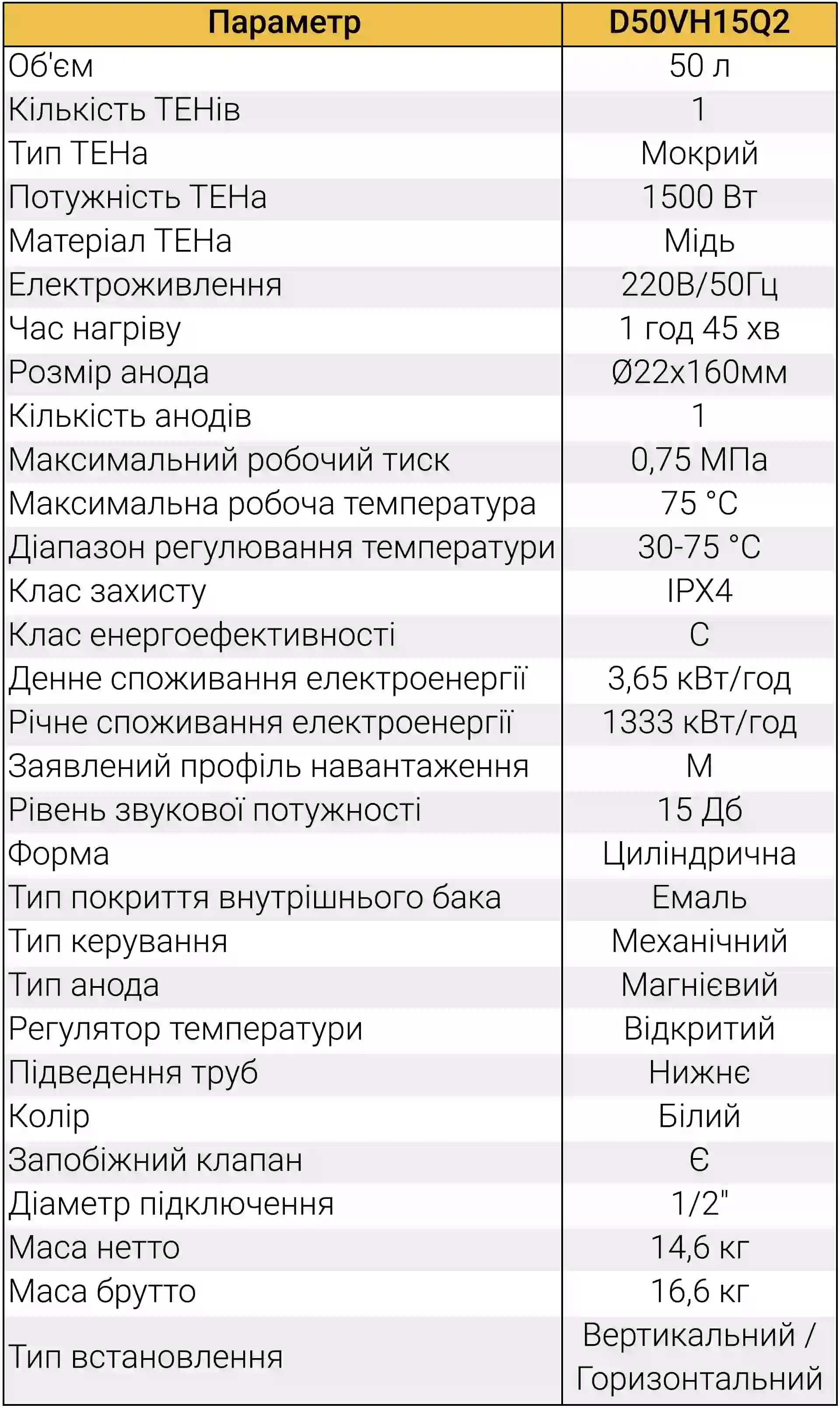 - Повний бак (50 л) нагрівається всього за 1 годину 57 хвилин.