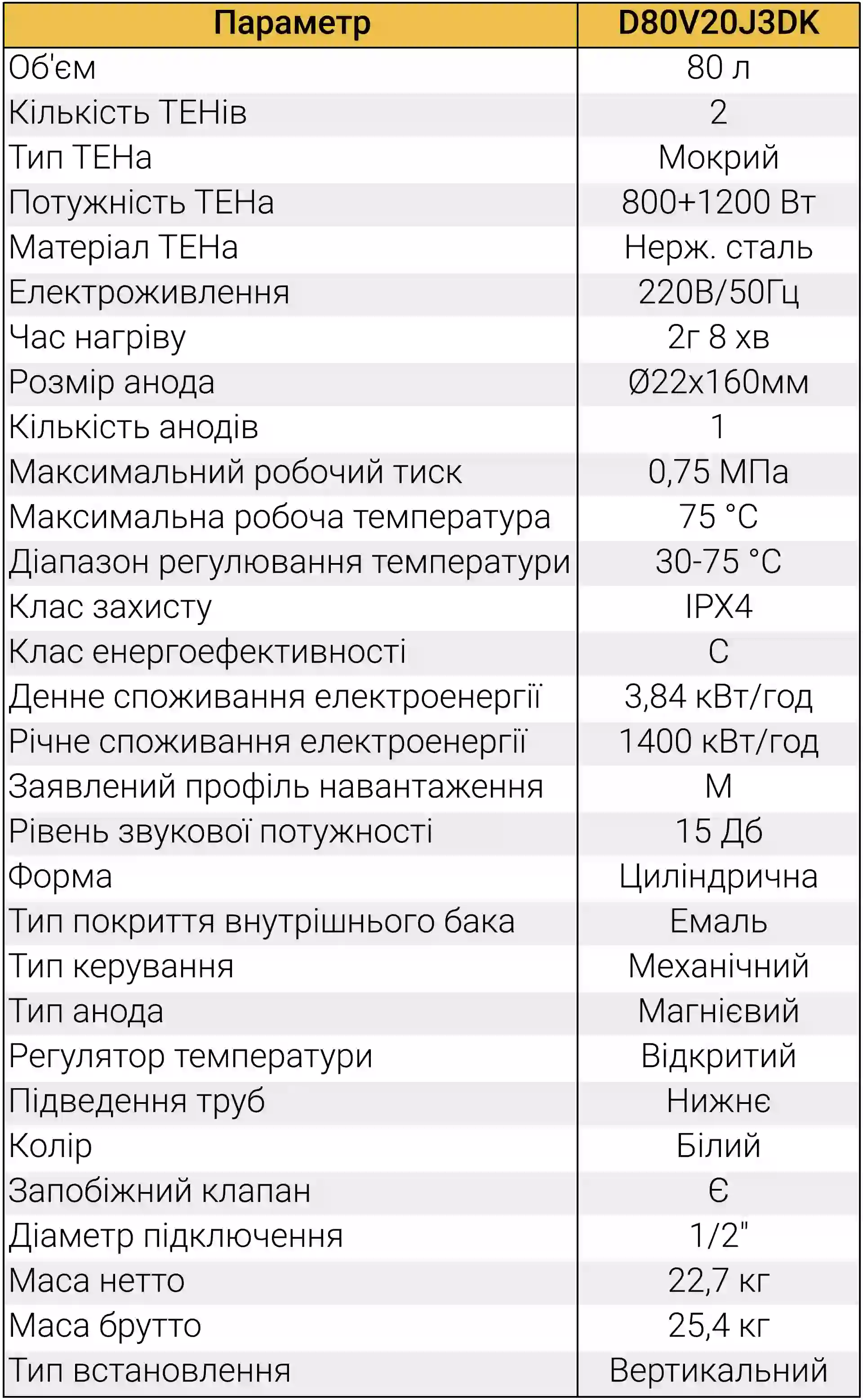 Головна особливість моделі D80V20J3DK — використання двох незалежних «сухих» нагрівальних елементів (800 Вт та 1200 Вт). На відміну від класичних «мокрих» ТЕНів, вони не контактують з водою, оскільки захищені спеціальними емальованими трубками.