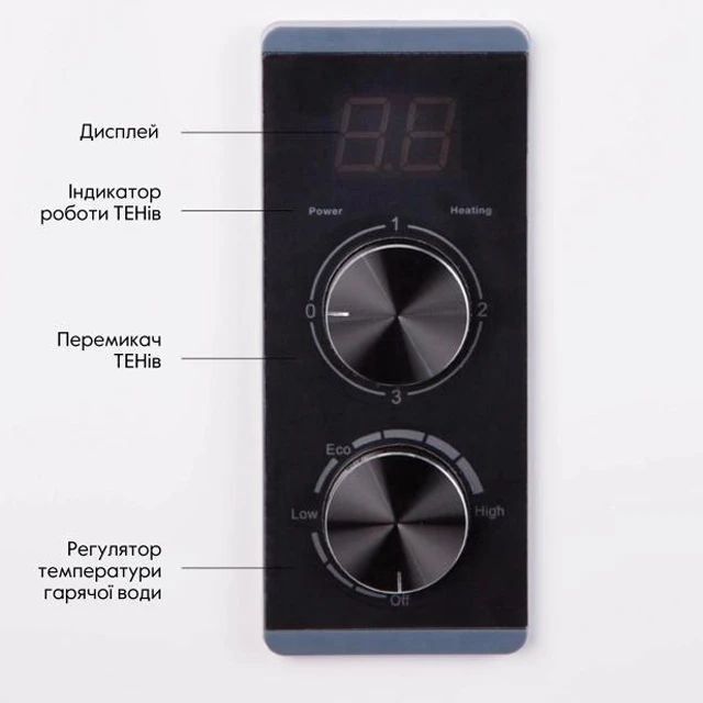 - Керувати навантаженням: ви можете використовувати один або два нагрівальні елементи залежно від потреби та стану електромережі.