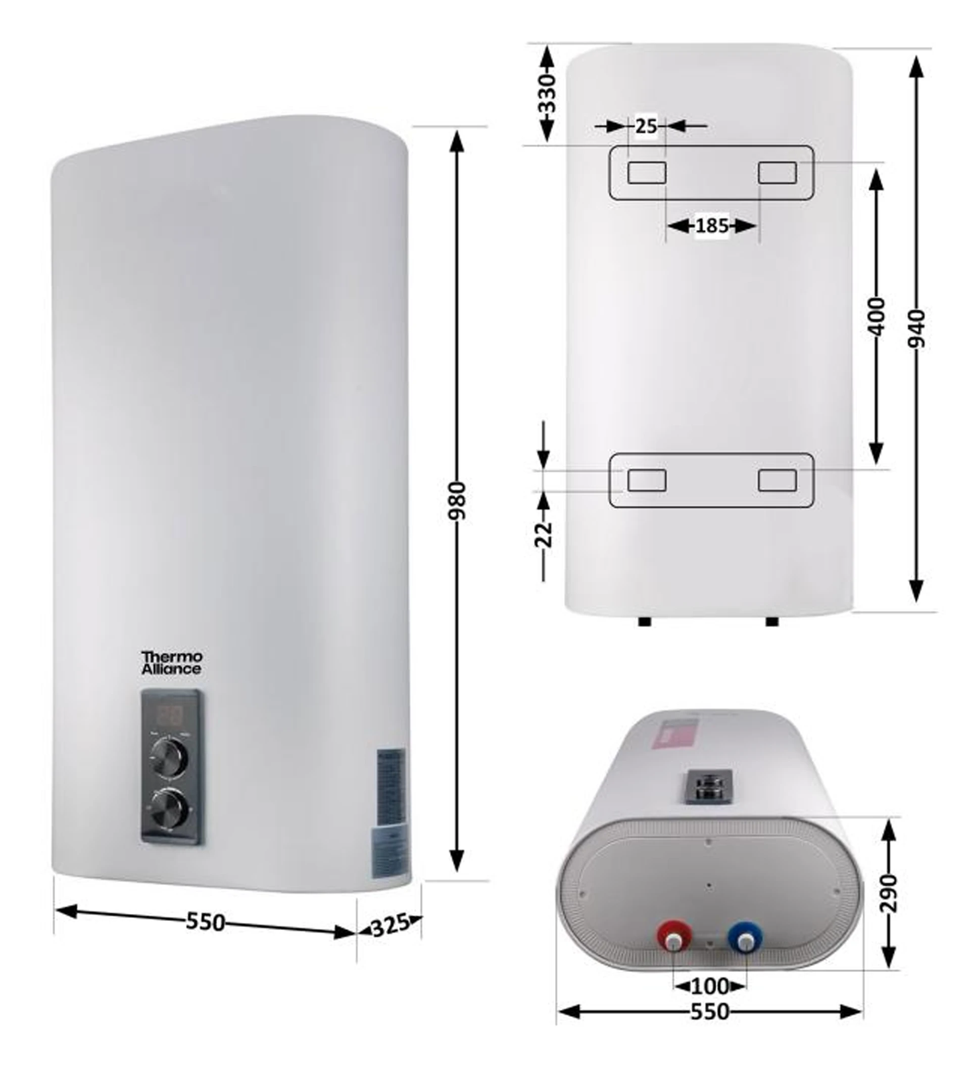 Завдяки прямокутній (пласкій) формі, пристрій займає значно менше місця, ніж класичні циліндричні моделі. Глибина всього 325 мм дозволяє змонтувати його у вузьких нішах або спеціальних шафах. Зручна механічна панель керування з цифровим дисплеєм дозволяє точно відстежувати поточну температуру води, роблячи експлуатацію простою та зрозумілою.