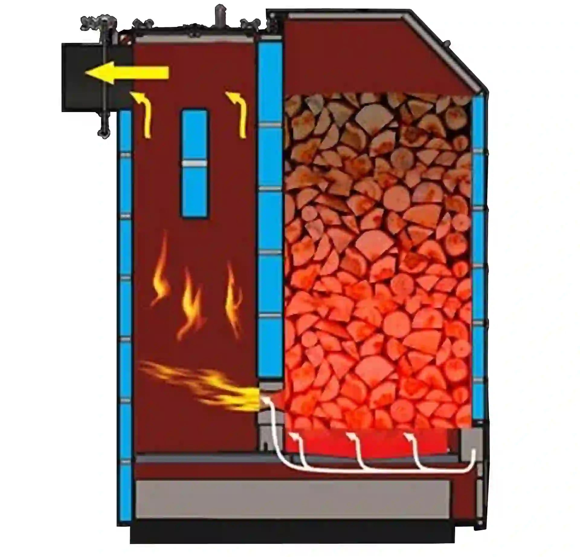 Твердопаливний котел Брест Цитадель використовує метод нижнього горіння, що дозволяє зберігати тепло довше та забезпечує рівномірне спалювання палива. Процес роботи включає: