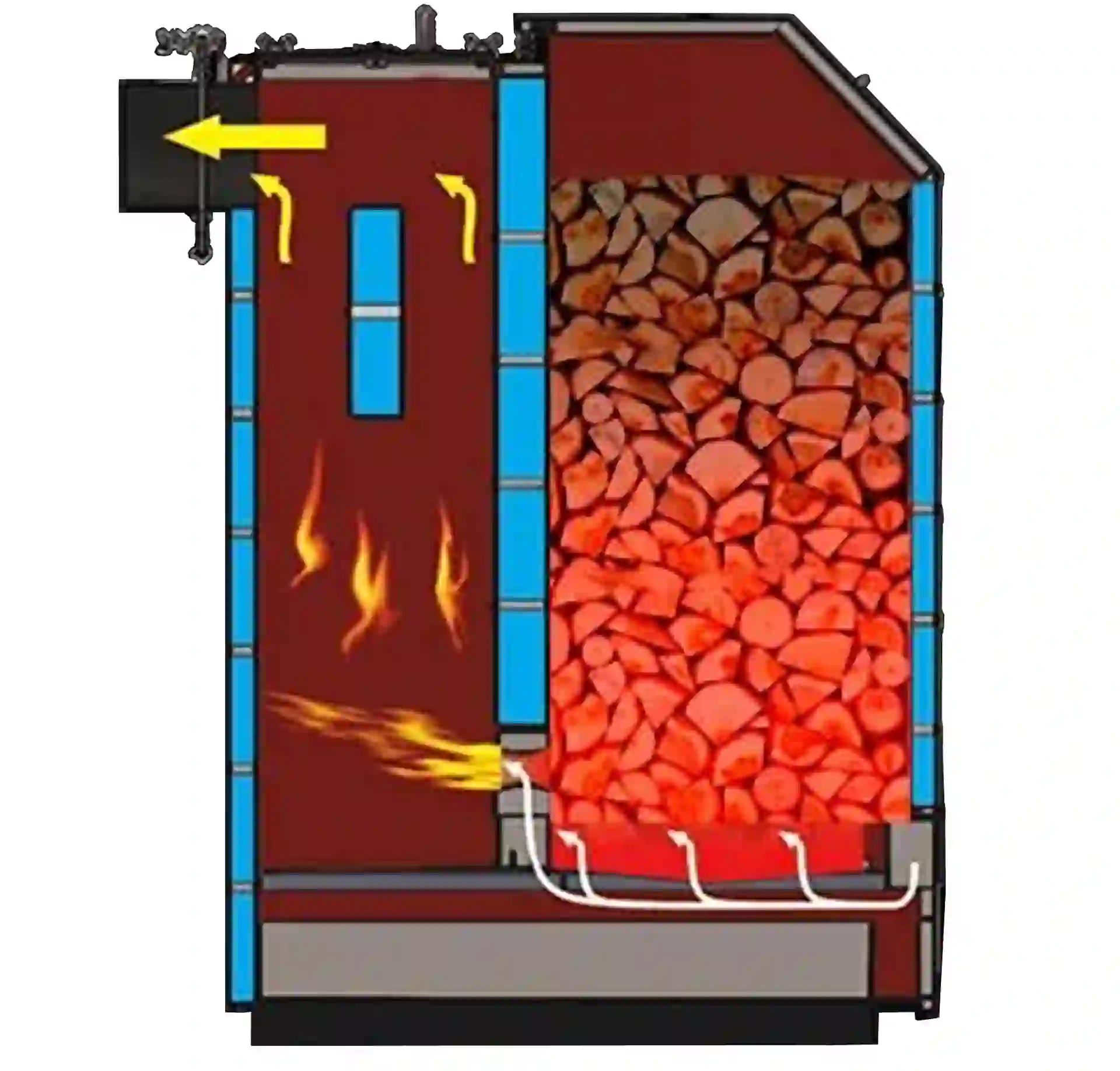 Котел працює за принципом нижнього горіння палива, що дозволяє забезпечити стабільне тепловиділення та економію палива. Косе завантаження палива та шахтний теплообмінник сприяють оптимальному розподілу тепла, а сухий чавунний колосник гарантує тривалий термін служби.
