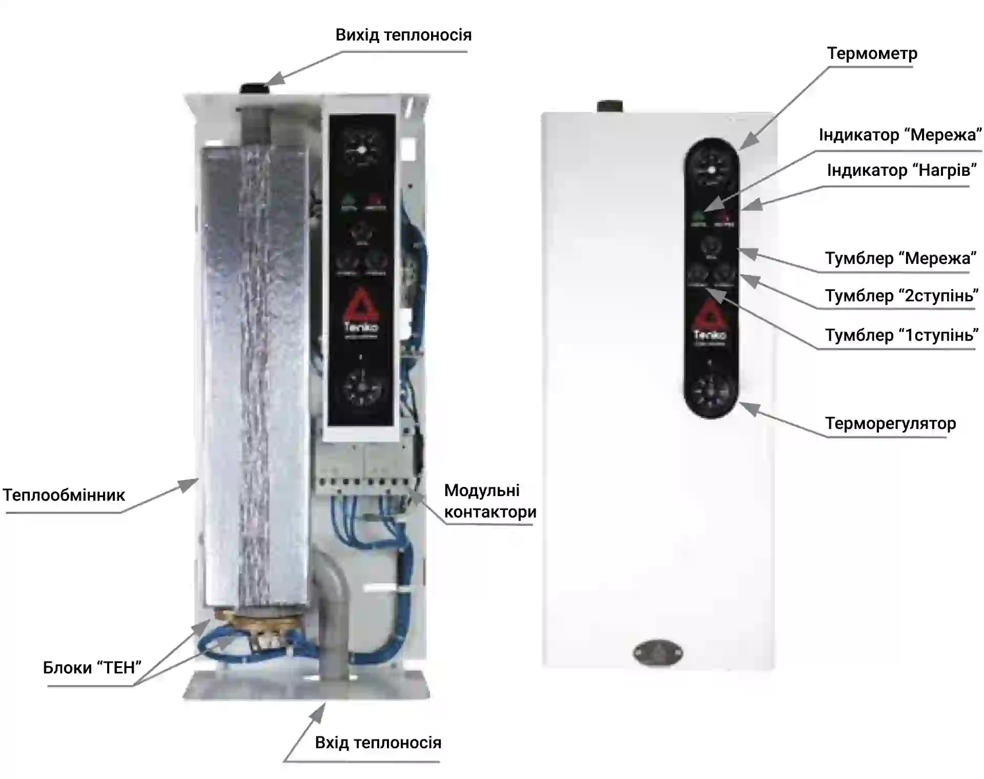 Серцем пристрою є надійний теплообмінник, виготовлений із товстостінної сталевої труби від провідного вітчизняного виробника. Нагрів теплоносія здійснюється за допомогою потужних трубчастих електронагрівачів (ТЕНів). Щоб виключити будь-які ризики протікання під час максимальних зимових навантажень, кожен блок ще на етапі збірки проходить суворі гідравлічні випробування під тиском 8 бар та обробляється антикорозійним складом.