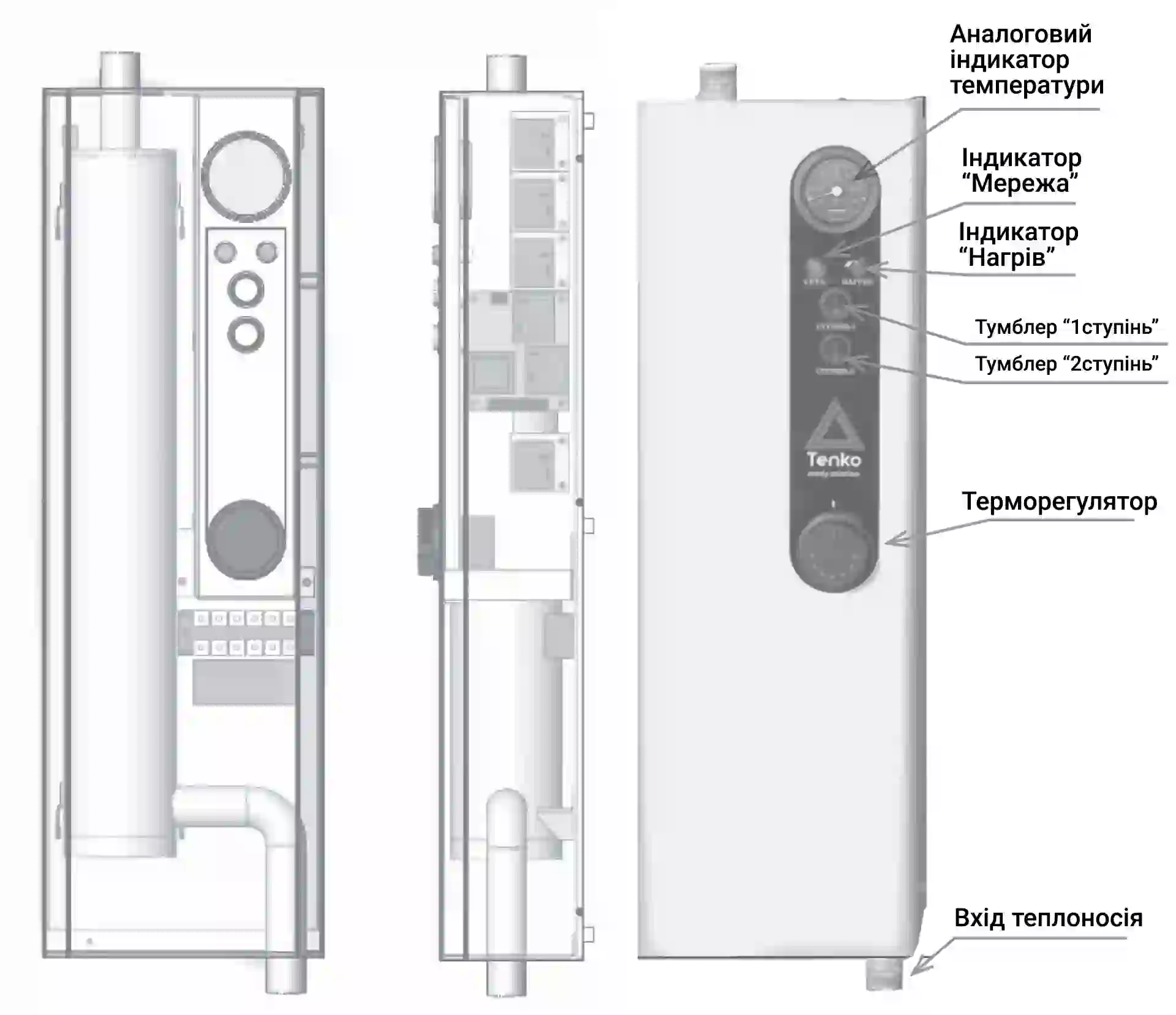 Процес нагріву відбувається завдяки якісним трубчастим електронагрівачам (ТЕНам). Ви можете легко керувати мікрокліматом завдяки вбудованому італійському капілярному термостату IMIT. Він забезпечує плавне та точне регулювання температури теплоносія в межах від 0 до 90°С. Крім того, надійний котел тенко оснащений аналоговим термометром та яскравими світловими індикаторами, які допомагають візуально контролювати поточний режим роботи обладнання.