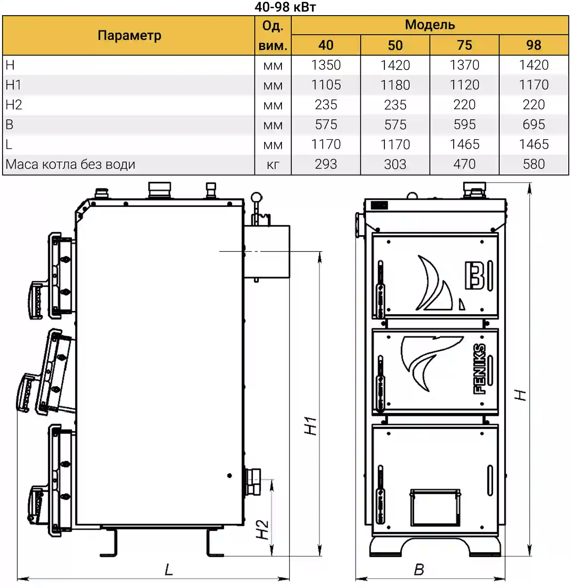Твердопаливні котли Feniks B New виготовляються в Україні та відповідають європейським стандартам якості. Лінійка представлена моделями потужністю 10, 15, 20, 25, 30, 40, 50, 75 і 98 кВт, що дозволяє підібрати оптимальне рішення для приміщень від 100 до 980 м².
