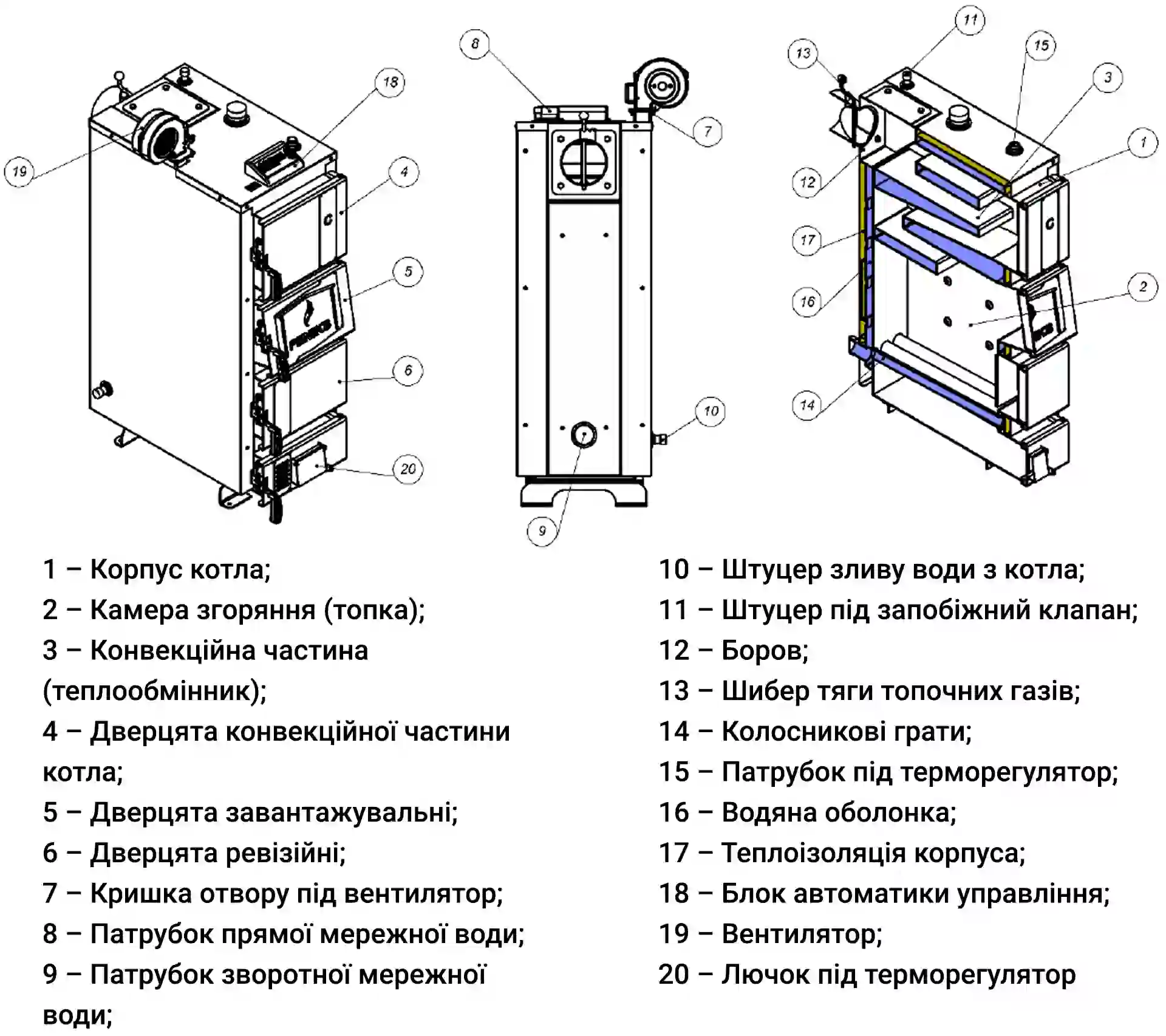 Варто зазначити, що блок автоматичного керування, вентилятор та запобіжний клапан поставляються в упаковці від виробника. Гарантійне обслуговування твердопаливних котлів Фенікс здійснює виробник, зазначений у паспорті виробу.