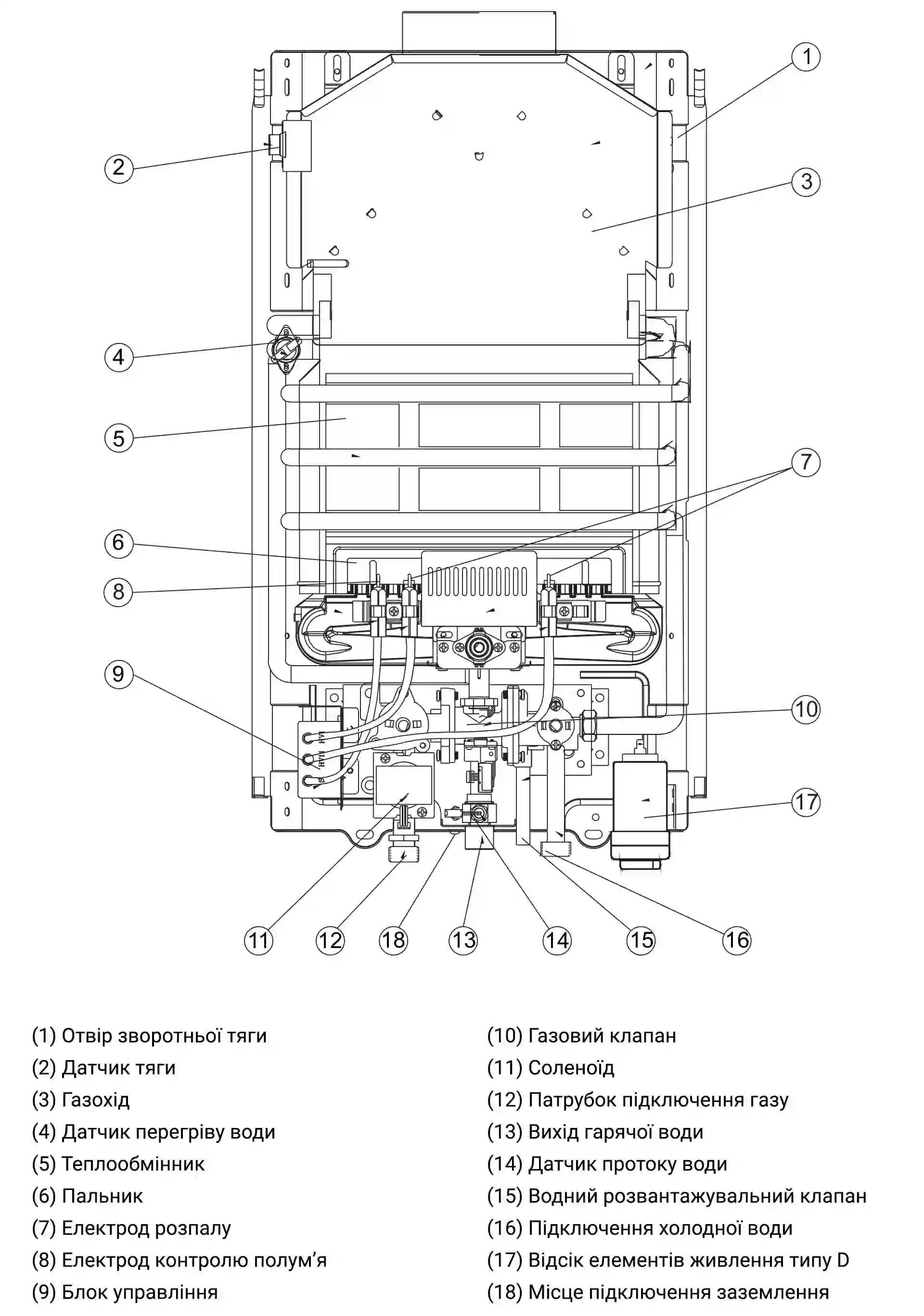 підключення подачі газу, холодної води та виходу ГВП. У верхній частині