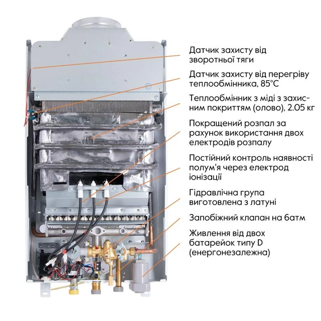 Газова колонка працює за принципом проточного нагріву води. Після відкриття крана гарячої води пристрій автоматично вмикається: газ запалюється, полум’я нагріває теплообмінник, через який протікає холодна вода. Уже через кілька секунд ви отримуєте гарячу воду потрібної температури.