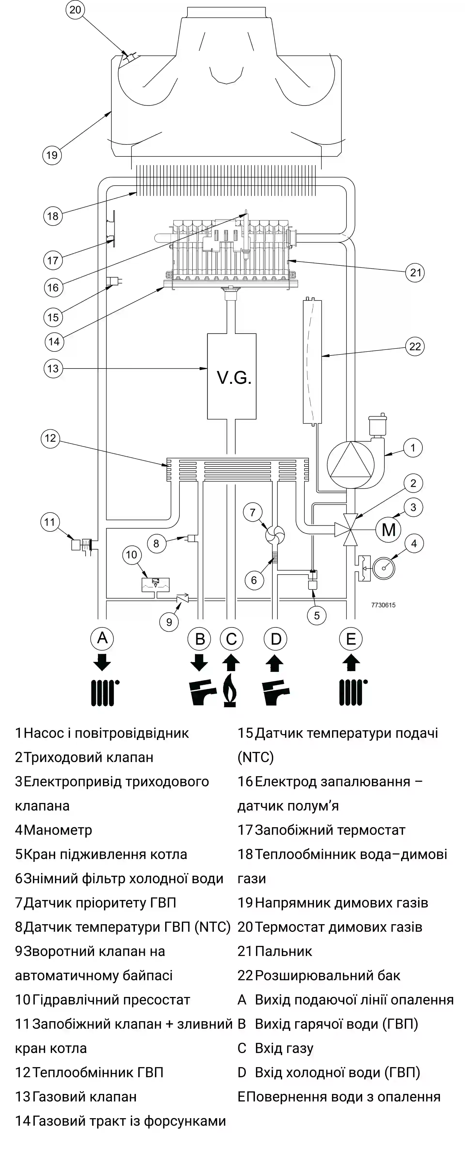 Принцип роботи димохідного агрегату базується на природній тязі — повітря для горіння береться безпосередньо з приміщення, а продукти згоряння виводяться через класичний вертикальний димохід. Це перевірене часом рішення, яке гарантує безшумну роботу та високу надійність. Головна ж функціональна перевага цієї моделі — продумана гідравлічна група з двома роздільними теплообмінниками. Первинний вузол, виготовлений із високоякісної міді, відповідає за швидкий нагрів контуру опалення. Водночас вторинний пластинчастий теплообмінник із міцної нержавіючої сталі забезпечує підготовку гарячої побутової води.