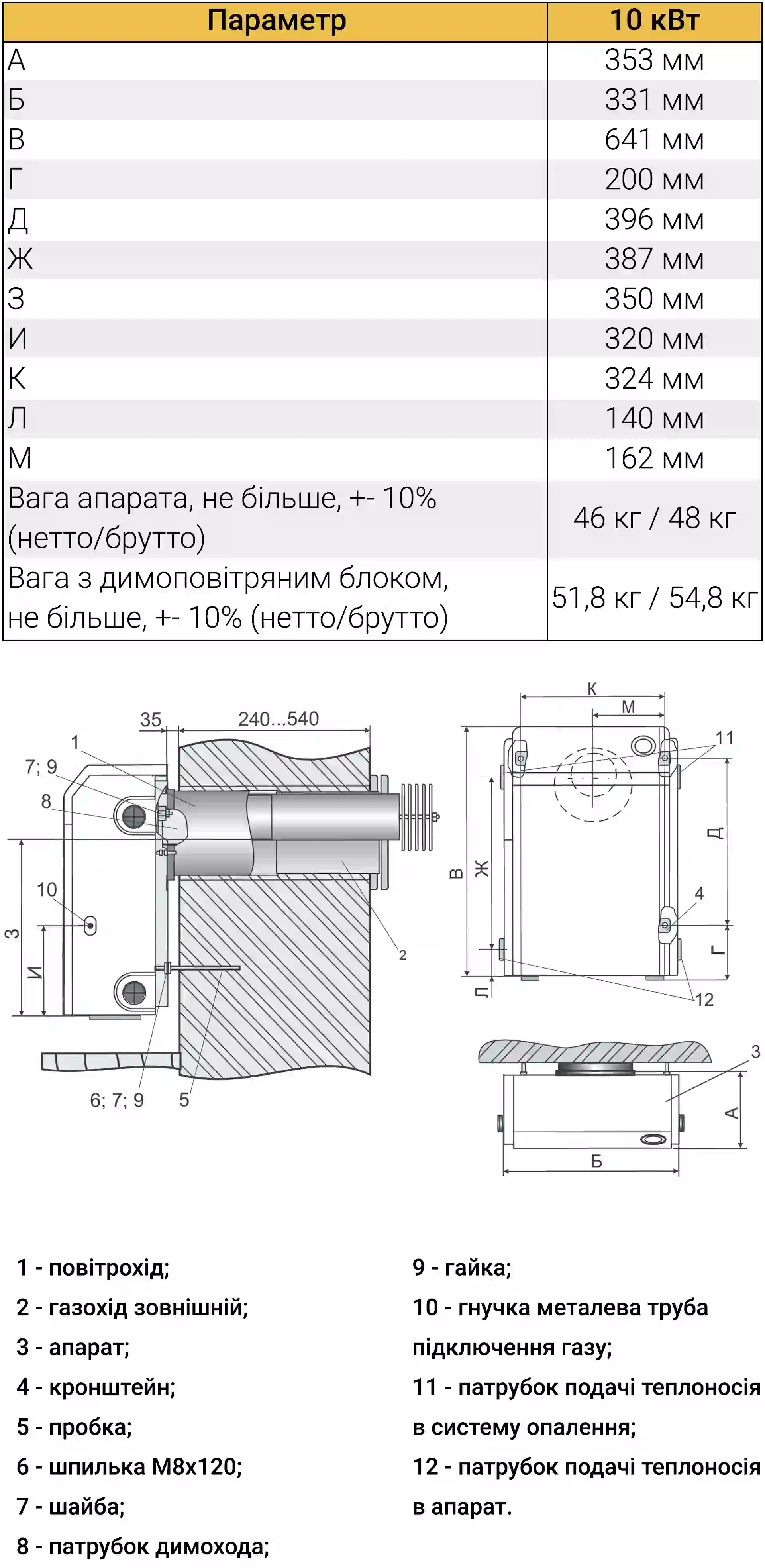 | Відведення газів | Через стіну (коаксіальне) |