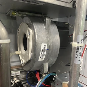 Вентилятор встановлено знизу, а не зверху. Це дозволяє більш точно дозувати повітряну суміш (турбонаддув), забезпечуючи повне згоряння газу. Система контролюється датчиком обертів та пресостатом.