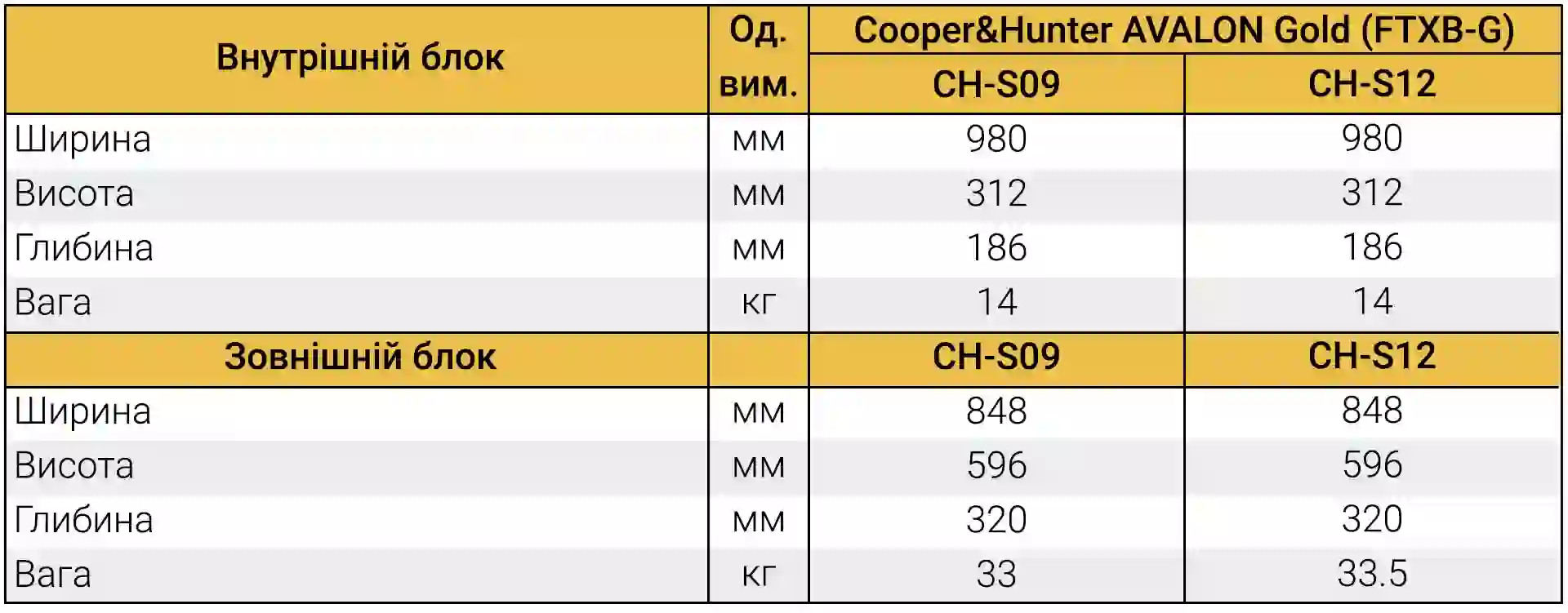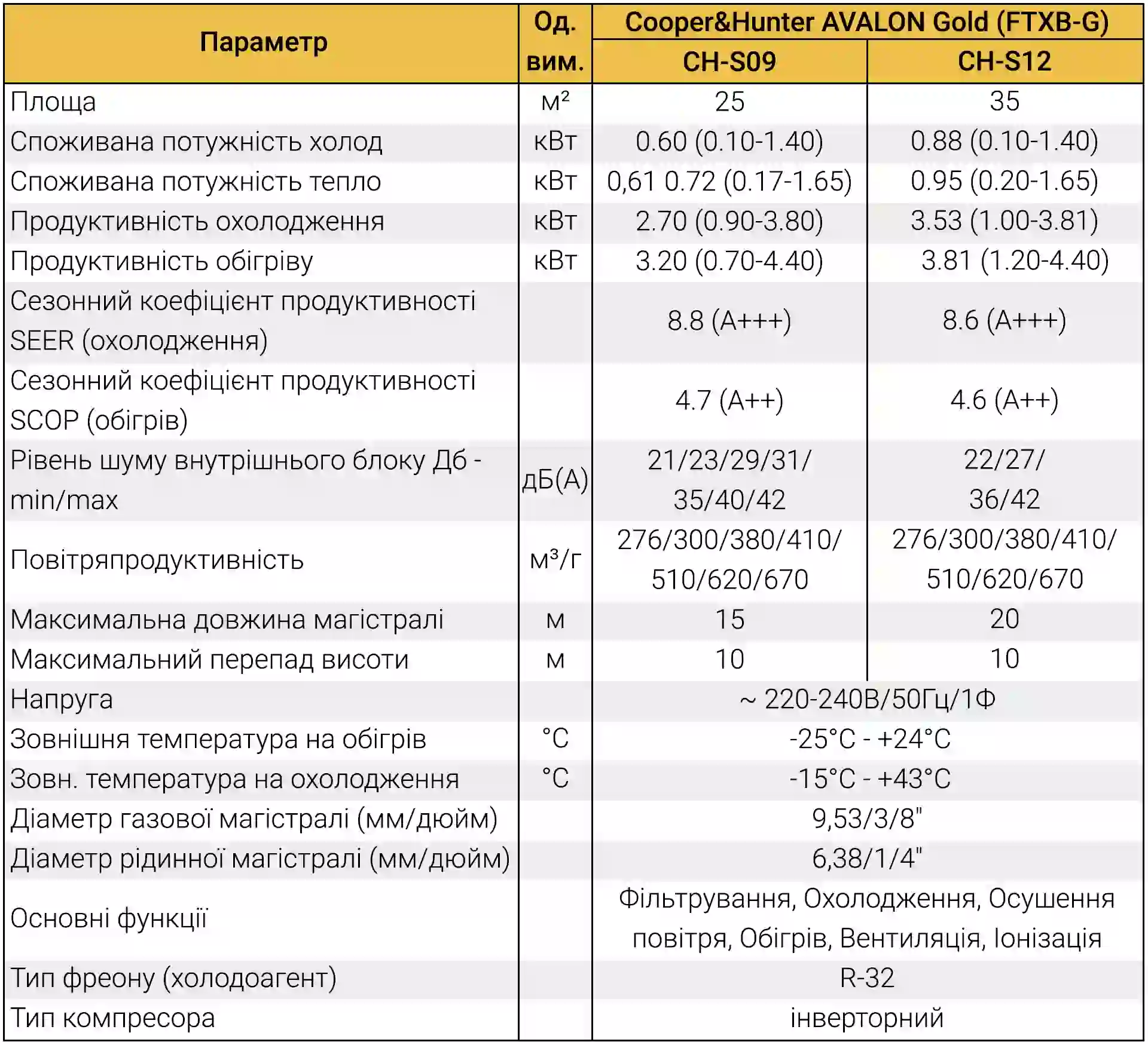 Cooper&Hunter кондиціонер серії AVALON Gold — це вибір для тих, хто не визнає компромісів між стилем та функціональністю. Вишуканий золотий колір внутрішнього блоку стане акцентом в інтер'єрі, а технологічна начинка забезпечить ідеальний клімат. Незалежно від того, чи оберете ви модель CH-S09FTXB-G для спальні, чи CH-S12FTXB-G для вітальні, ви отримаєте надійний, тихий та неймовірно економічний пристрій, здатний працювати цілий рік.