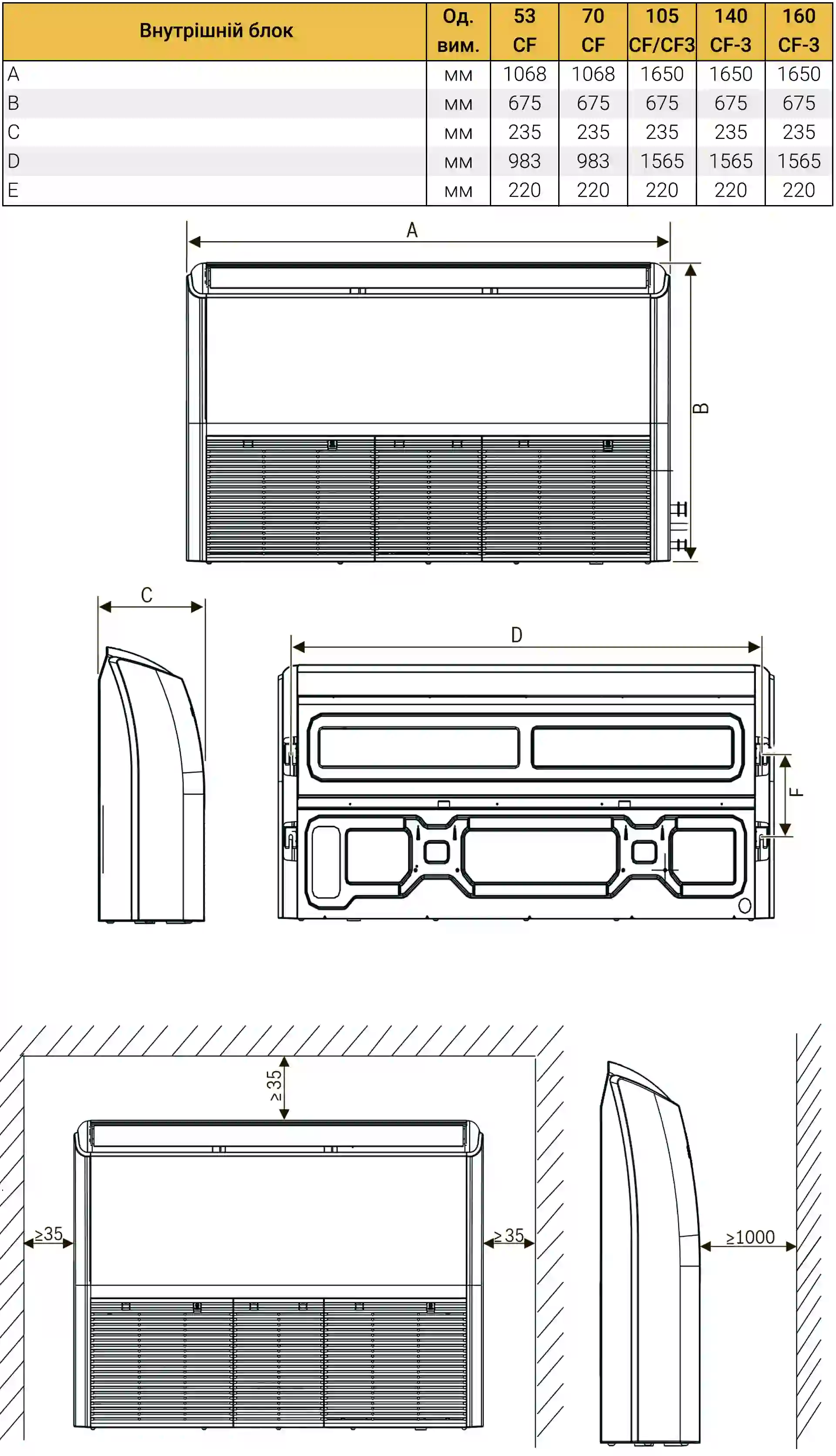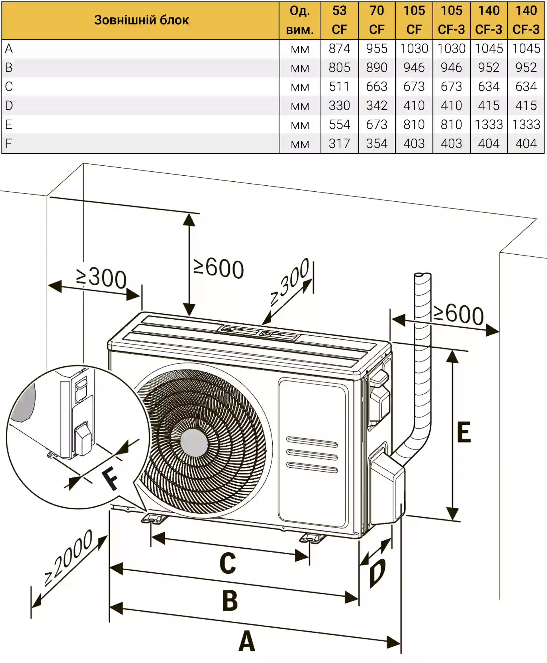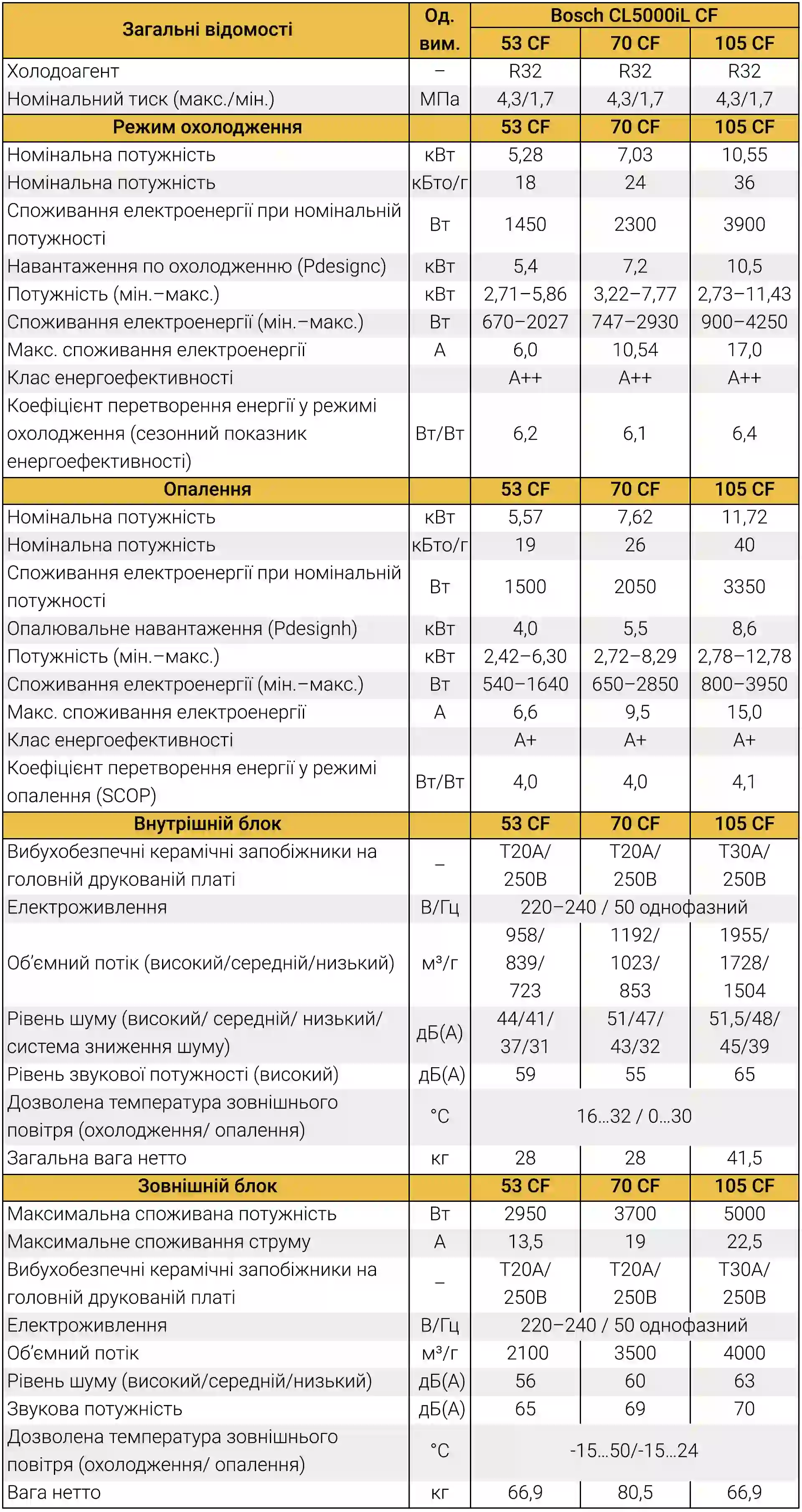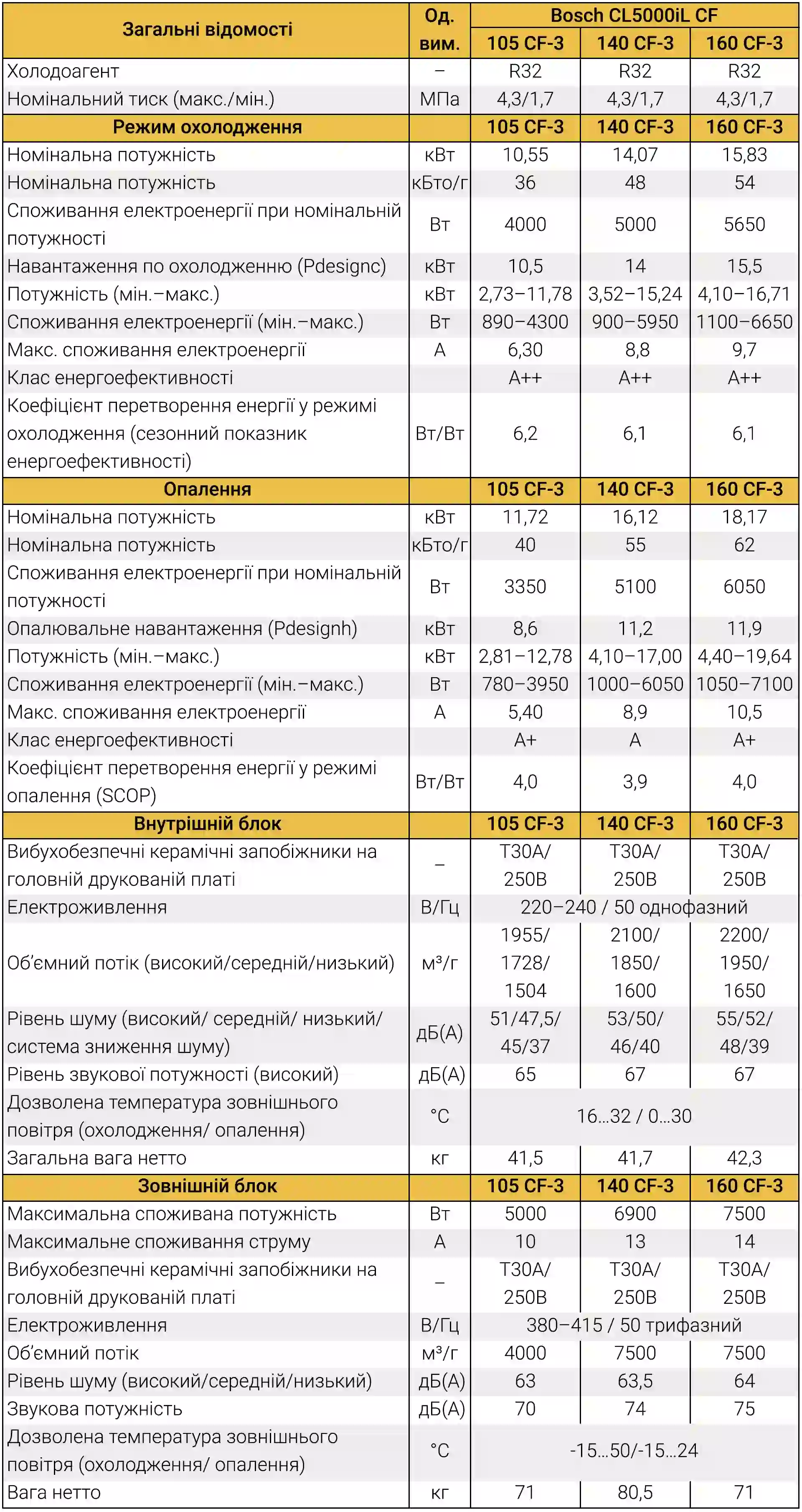 - CF-3 — трифазні моделі з підвищеною продуктивністю та можливістю прокладати довші траси між блоками.