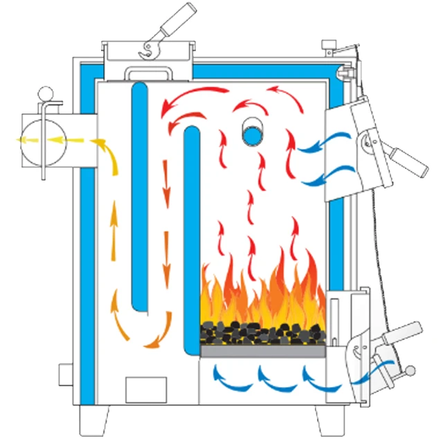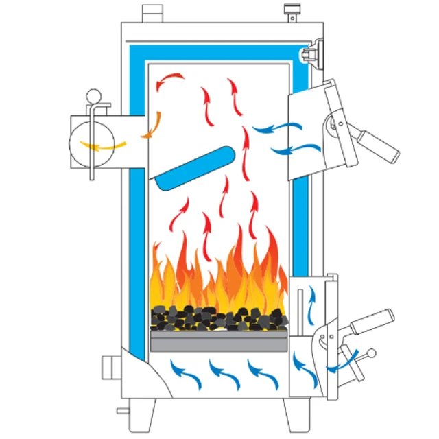 для завантаження палива і мають похилий борів. Нижні двері служать для чищення колосників і видалення золи.