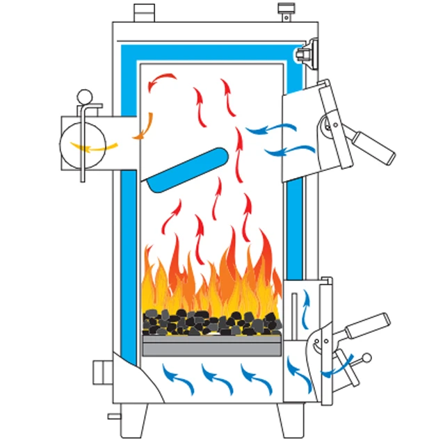 для завантаження палива і мають похилий борів. Нижні двері служать для чищення колосників і видалення золи.