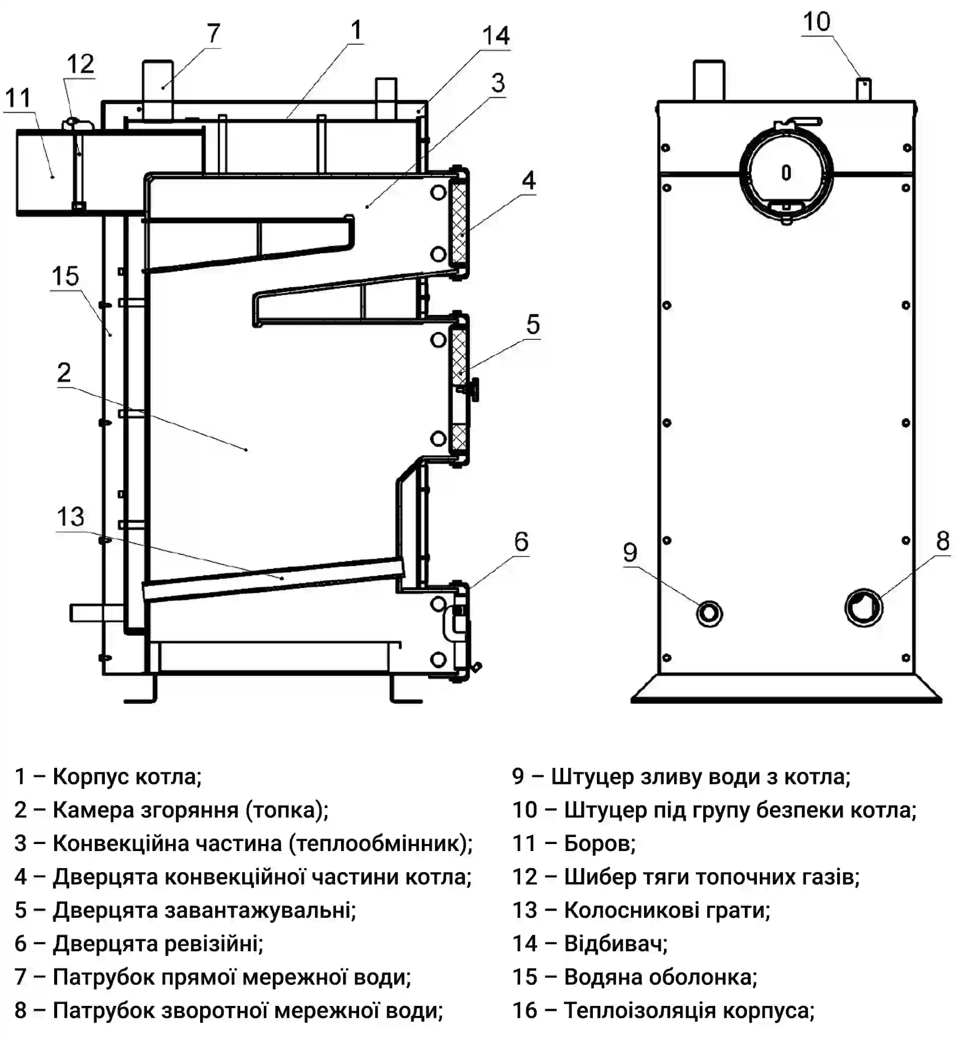 - Довговічність матеріалів: Корпус виготовлений із високоякісної котлової сталі 09Г2С товщиною 5 мм, що гарантує стійкість до прогоряння та тривалий термін служби.
