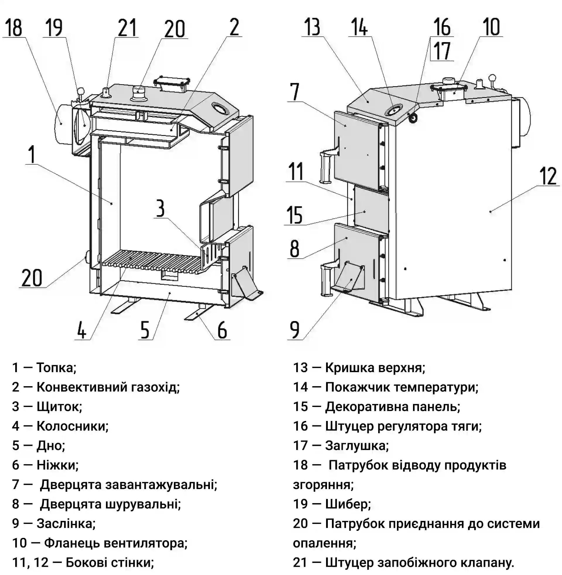- Теплообмінник із котлової сталі товщиною 5 мм.
