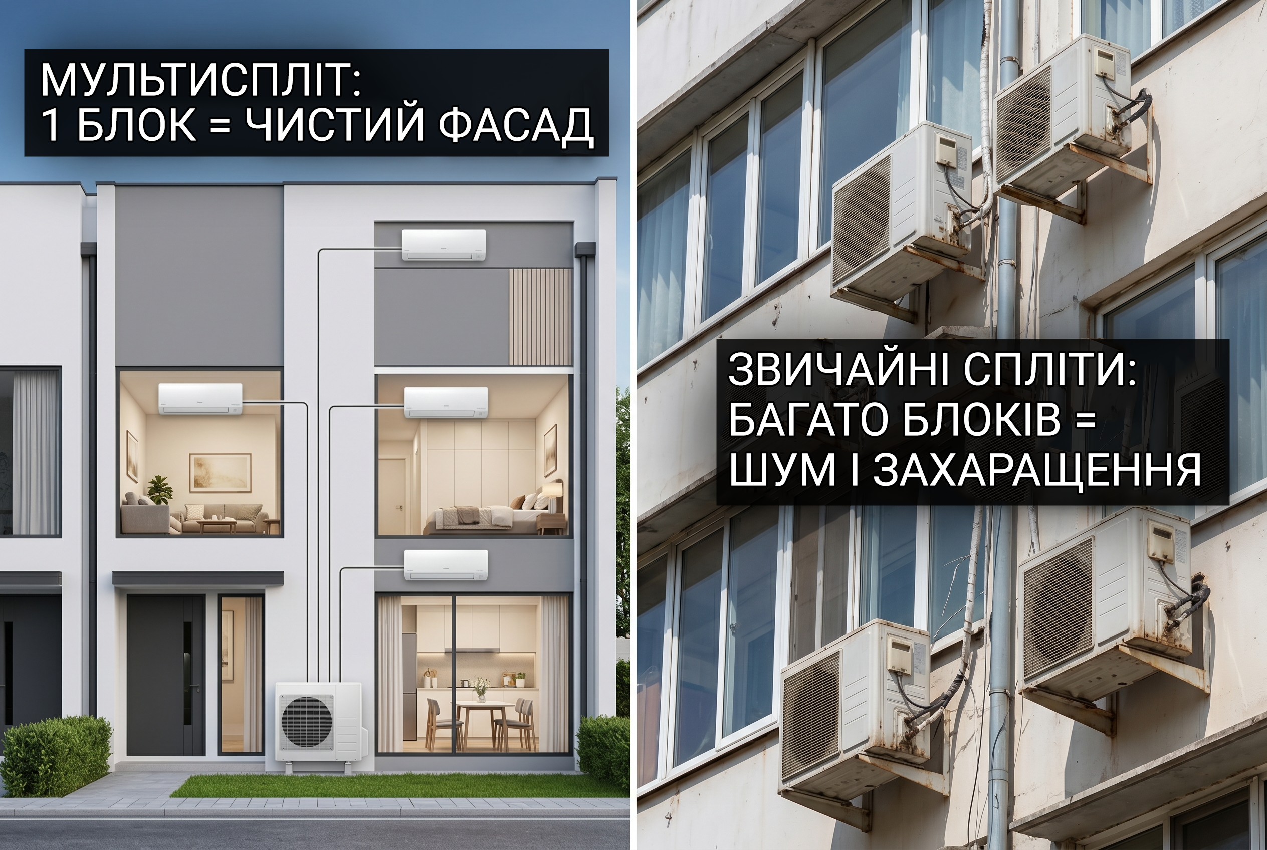 | Зовнішні блоки | Один — компактно та естетично | Багато — «захаращують» фасад |