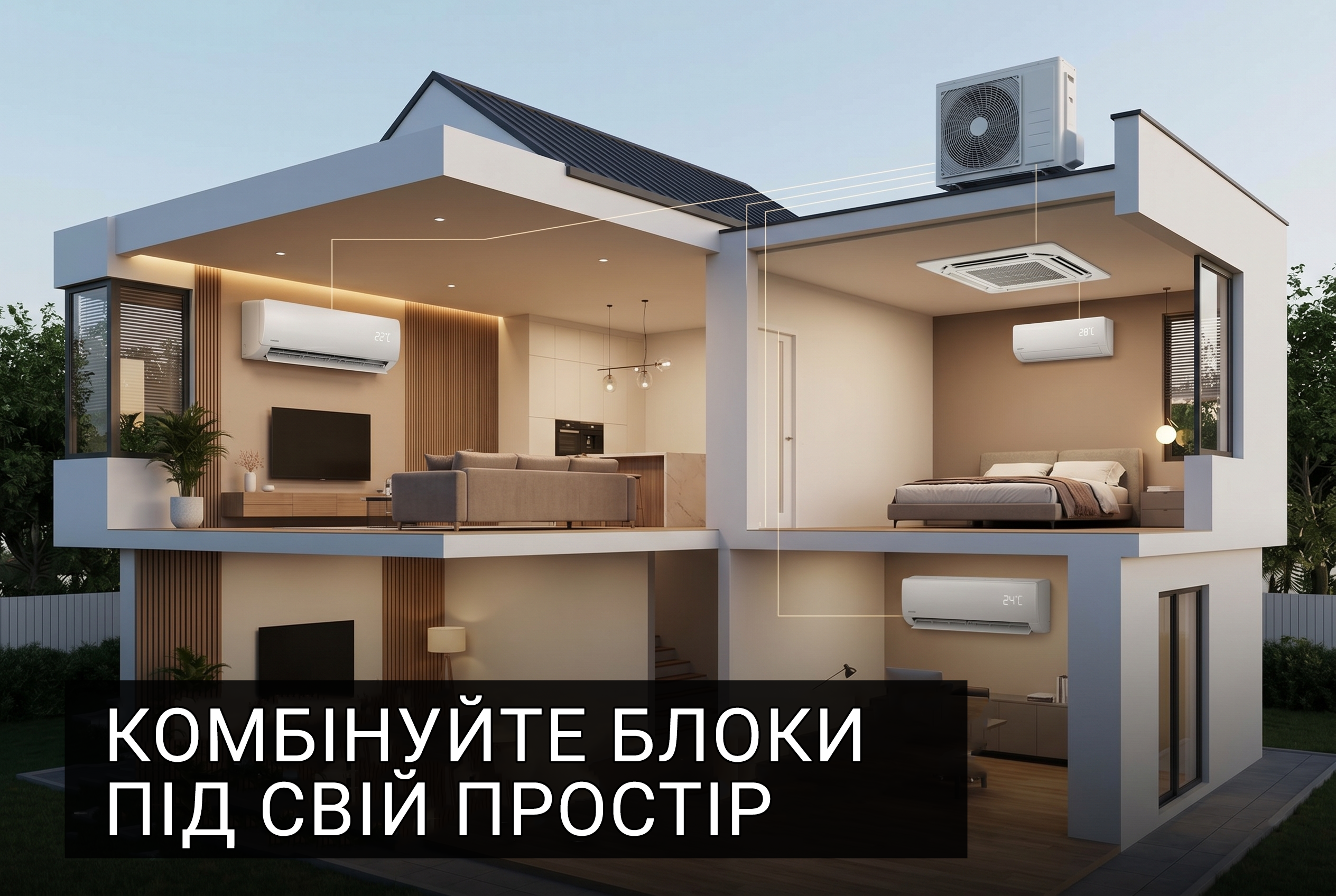 При цьому кожен внутрішній блок працює незалежно: ви можете виставити +22°C у спальні та +24°C у вітальні. Єдине обмеження — всі блоки повинні працювати в одному режимі: або всі на охолодження, або всі на обігрів. Це важливо враховувати, плануючи клімат у домі.