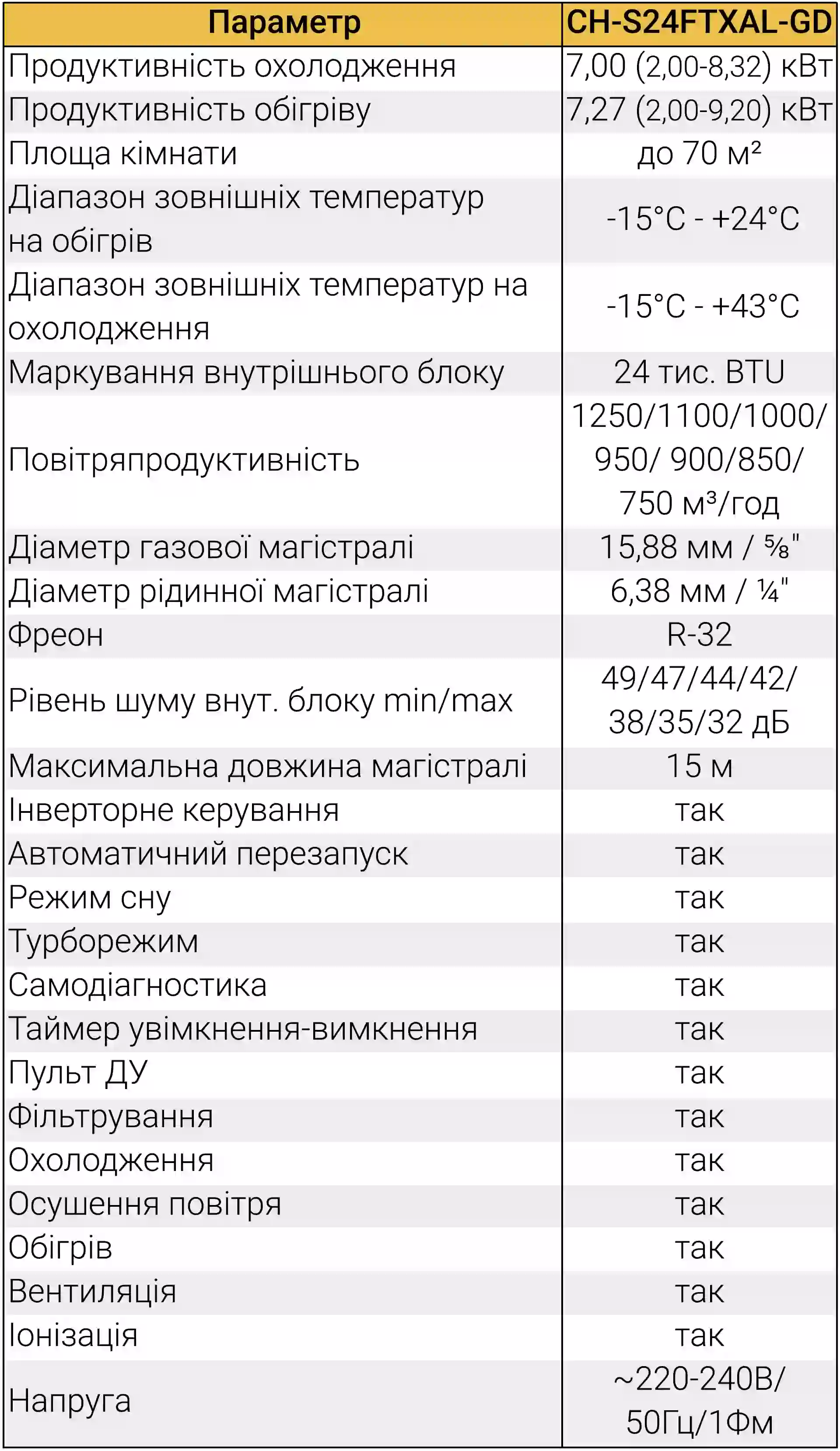 Цей інверторний кондиціонер розроблений для інтенсивної експлуатації. На відміну від побутових моделей економ-класу, CH-S24FTXAL-GD має збільшений ресурс роботи.