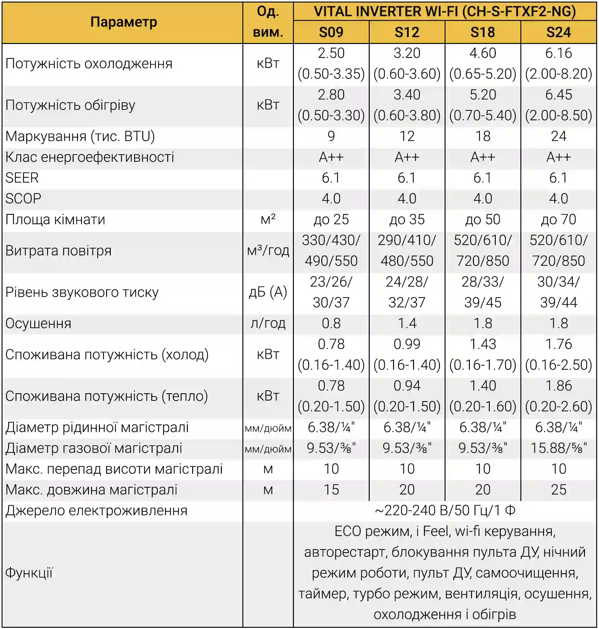Внутрішні блоки серії Vital доступні у чотирьох варіантах потужності. Вибір конкретної моделі залежить від площі приміщення, висоти стель та наявності теплопритоків (великі вікна, сонячна сторона).