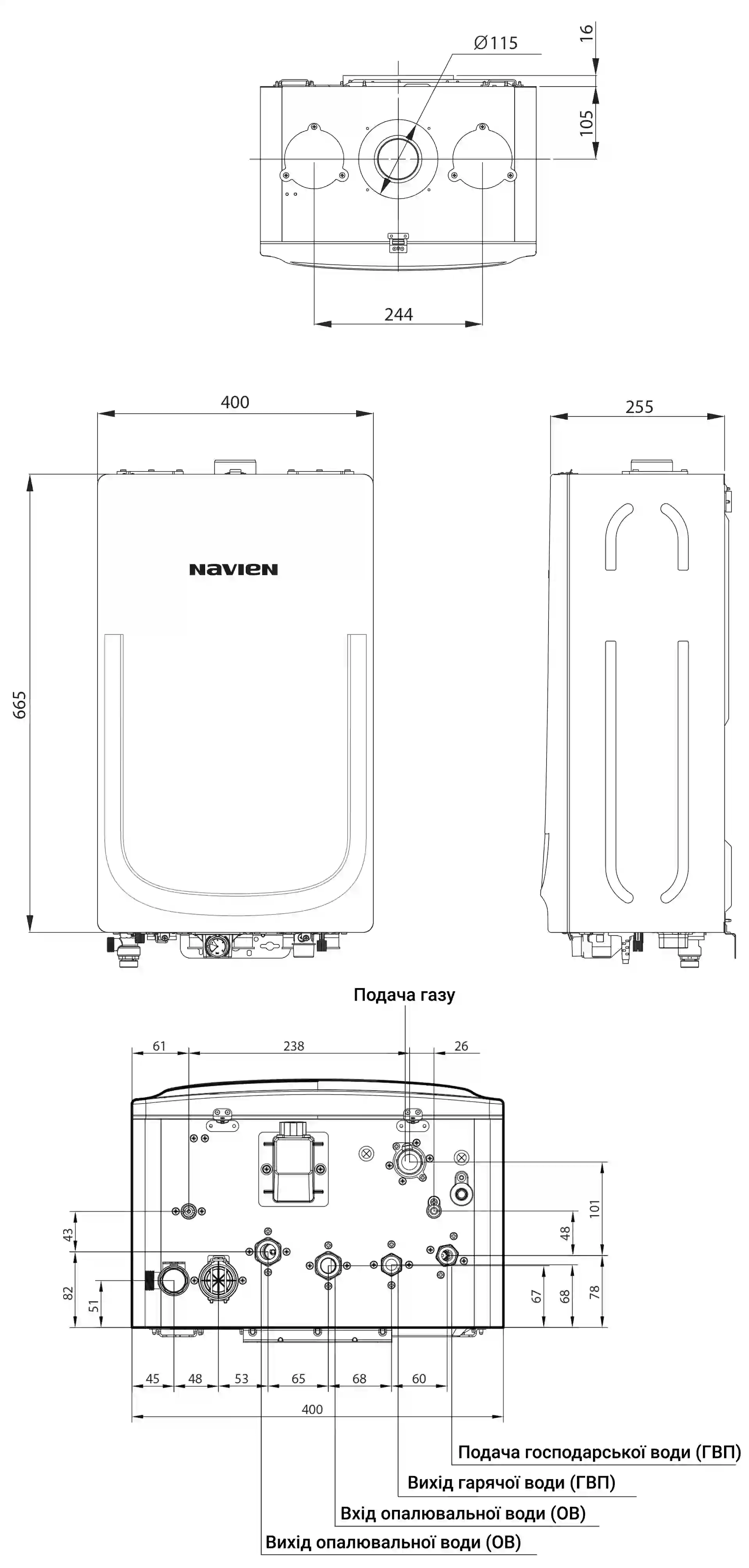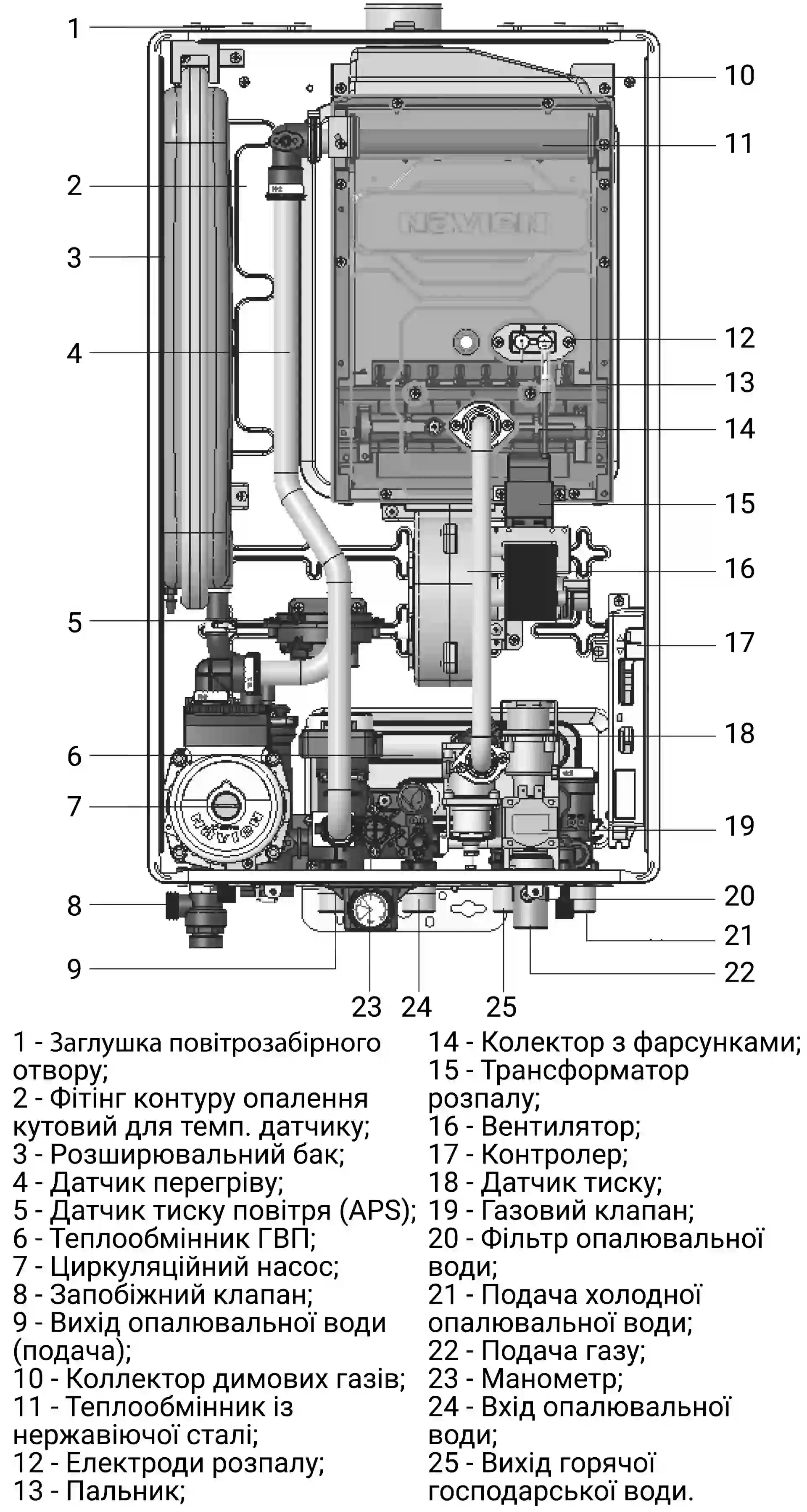 Е укомплектований теплообмінником з нержавіючої сталі. За рахунок застосування
