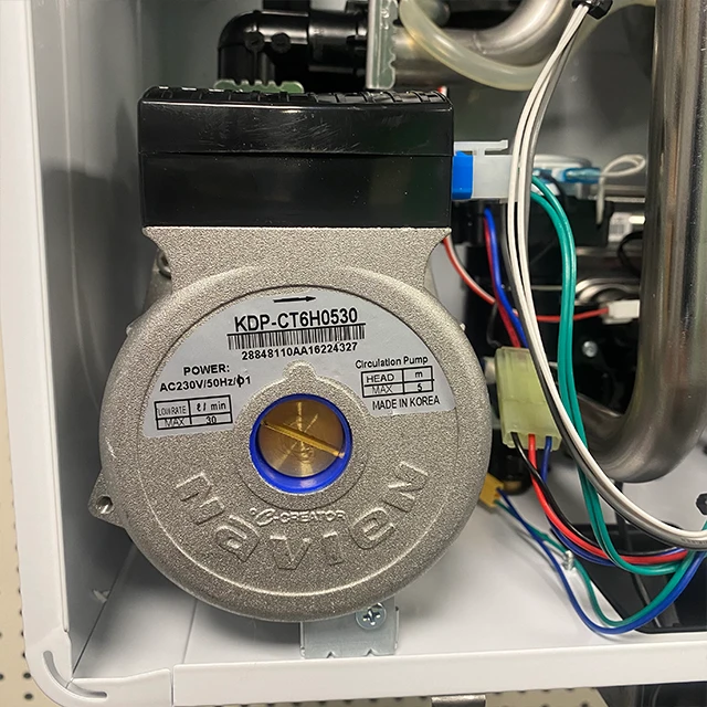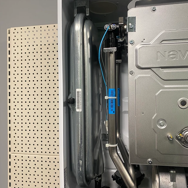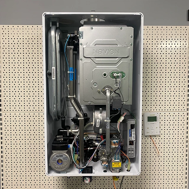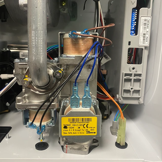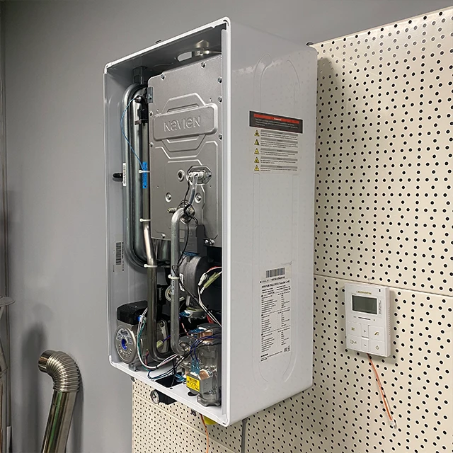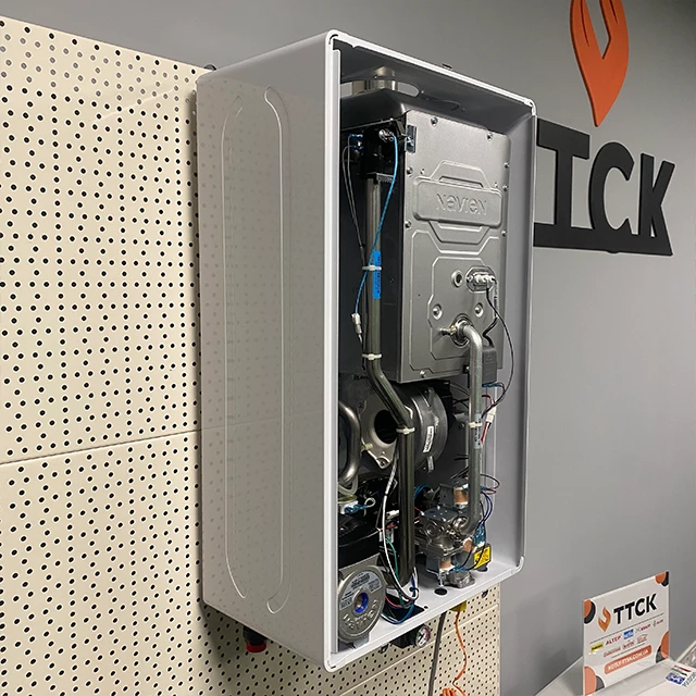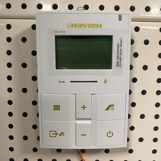 - Газовий двоконтурний корейський котел Navien серії Deluxe Е укомплектований виносним пультом управління з вбудованим датчиком температурного режиму теплоносія.