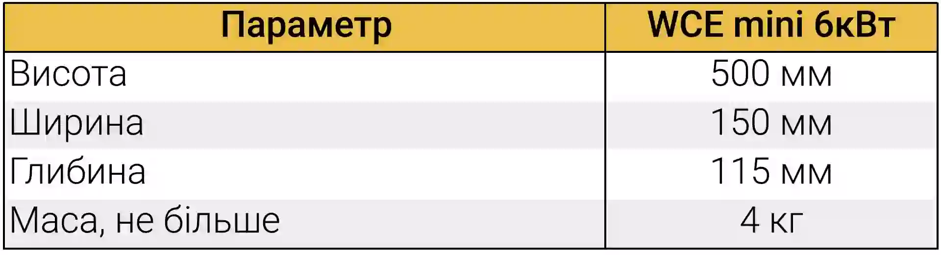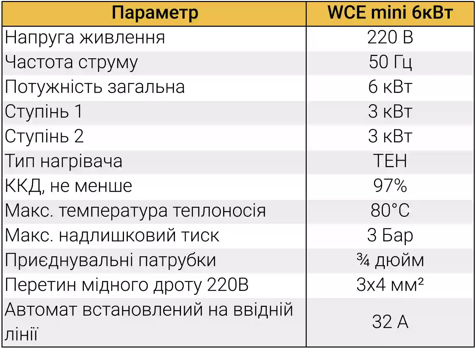 Модель WCE mini 6 кВт вимагає відповідального підходу до електропроводки. Струм споживання при повному навантаженні наближається до 27–30 Ампер. Тому перед тим як купити електрокотел такої потужності, переконайтеся, що ваша ввідна лінія здатна витримати таке навантаження.