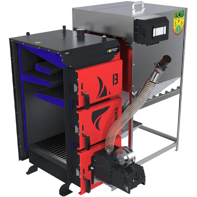 - Інтелектуальне керування: Роботою котла керує електронний контролер. Він постійно вимірює температуру води та на основі цих даних керує роботою шнека (подачею палива) та вентилятора, підтримуючи стабільний режим горіння. Також передбачена можливість підключення циркуляційного насоса системи опалення.