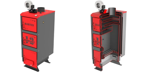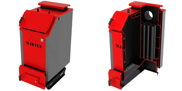 Якщо місця мало, а в планах є теплоакумулятор, Marten Comfort — ваш вибір. Цей котел мартен має верхній вихід димоходу, серйозний триходовий теплообмінник і йде в базі з електронною автоматикою. Дуже зручна фішка — важіль для чищення водонаповнених колосників.