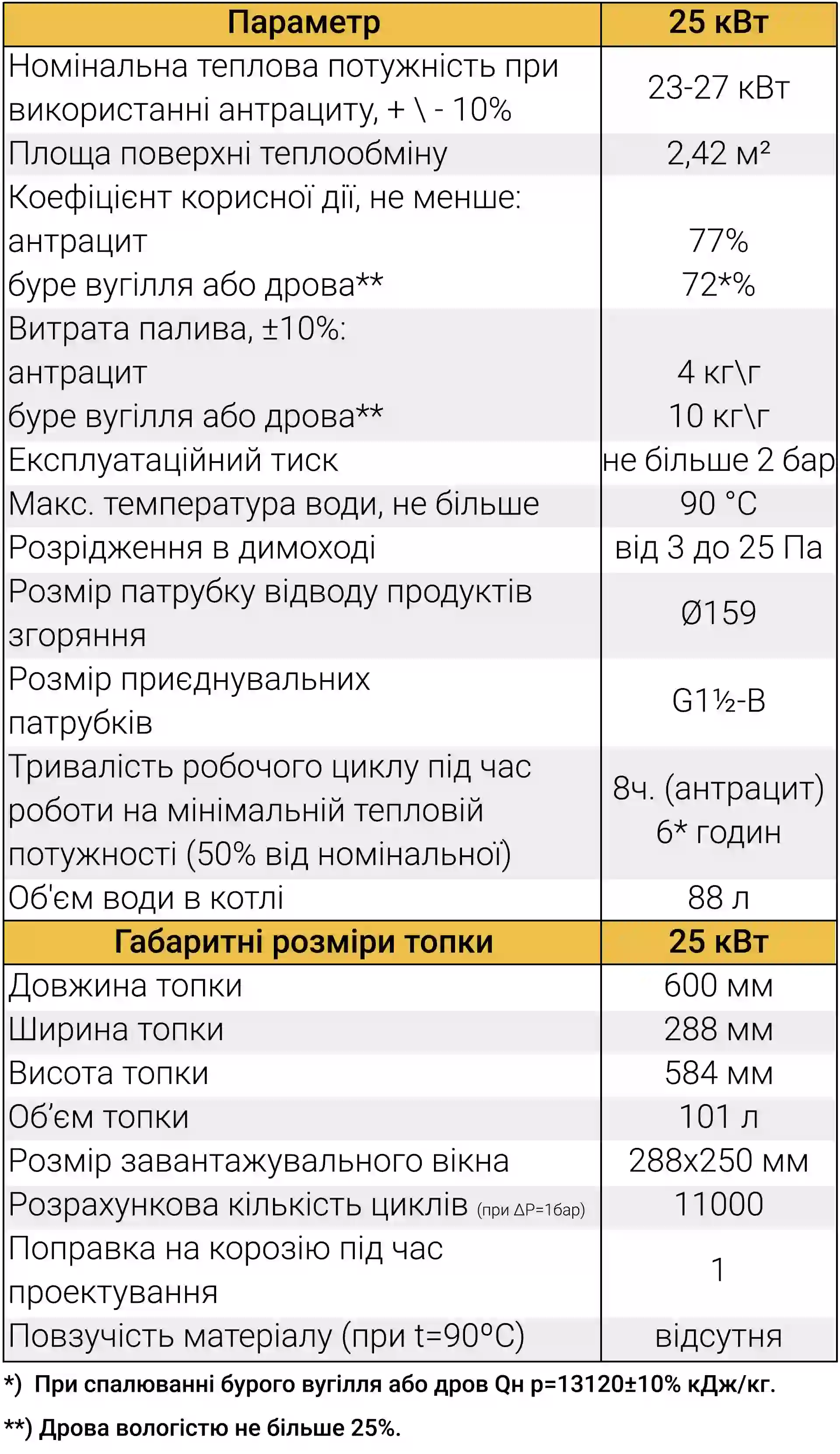 Для потужності 25 кВт критично важливим є об’єм палива, що завантажується одноразово. Твердопаливний котел Маяк цієї модифікації може похизуватися дійсно глибокою та об'ємною камерою згоряння. Глибина топки дозволяє використовувати довгі поліна, а збільшений літраж камери гарантує, що одного завантаження вистачить на тривалий час роботи без вашого втручання.