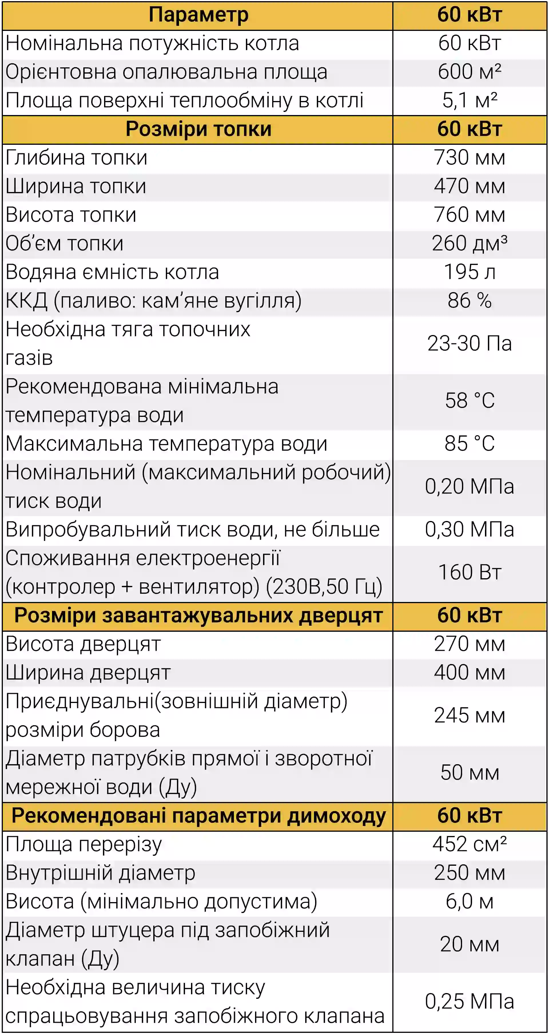 Головна відмінність моделі на 60 кВт від менш потужних аналогів — це вдосконалена архітектура теплообмінника. Якщо побутові версії мають 4 полиці, то тут інженери впровадили п'ятиходову систему.