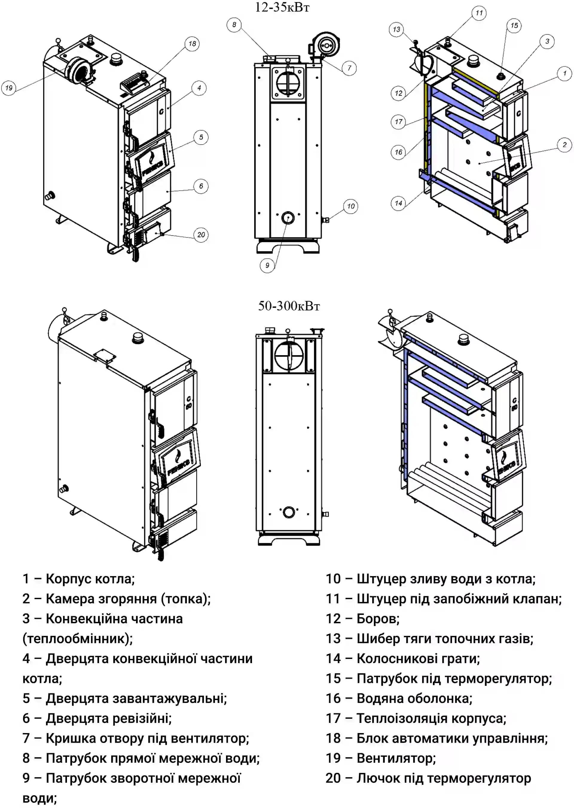 потужністю 12 кВт … 250 кВт. Функціонують на різних видів твердого палива: