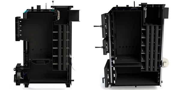 Їхня головна "фішка" — величезна вертикальна камера згоряння (шахта). Паливо горить лише у нижньому шарі, а верхній опускається вниз у міру прогорання. Це дозволяє завантажувати паливо рідше і використовувати сипкі або "складні" види палива: тирсу, тріску, обрізки, солому, агровідходи.